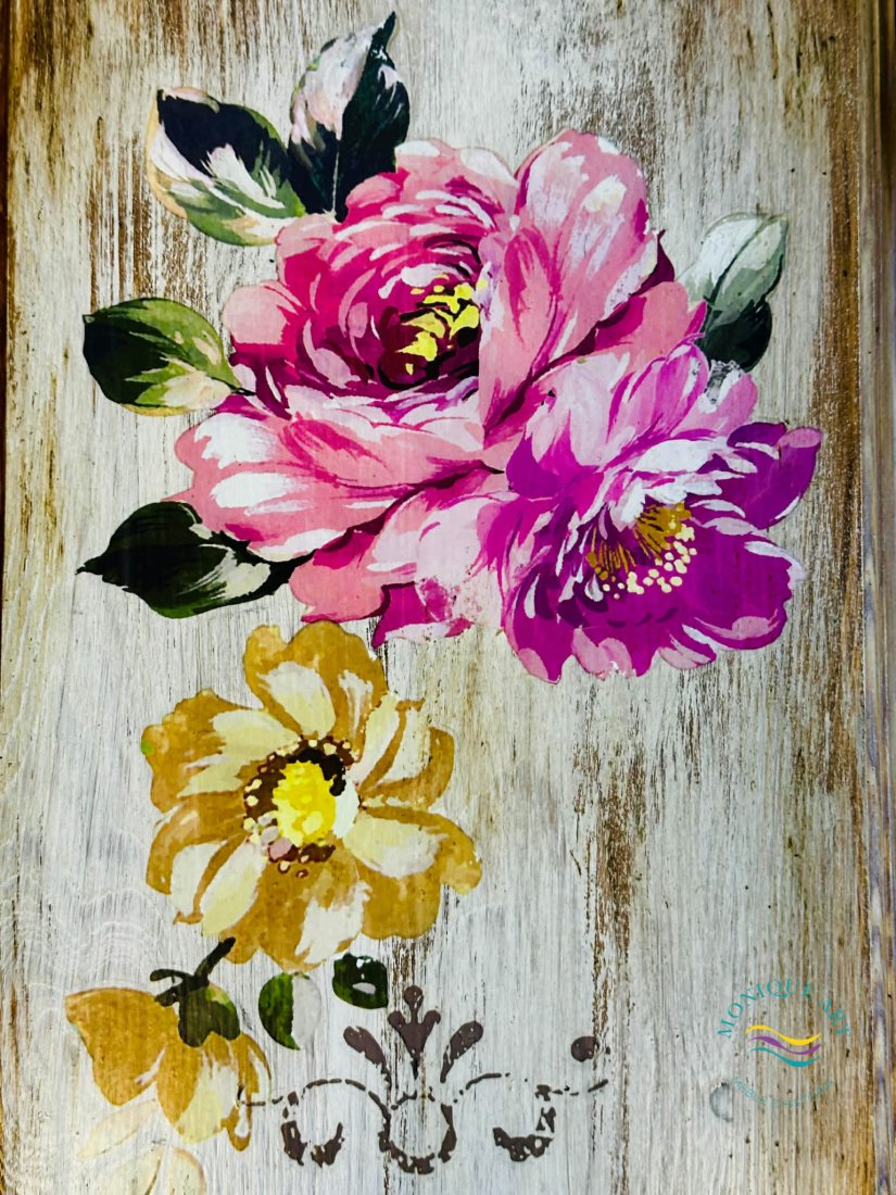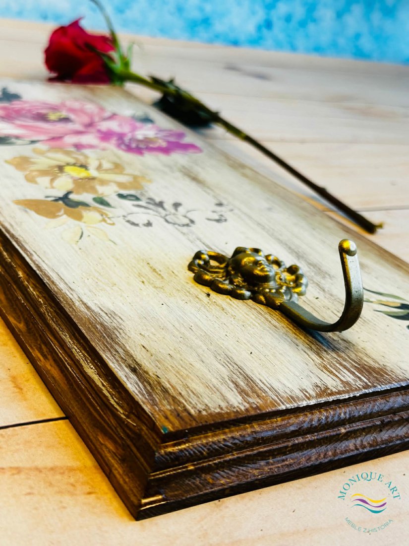 Drewniany wieszak w stylu shabby chic ozdobiony kwiatami