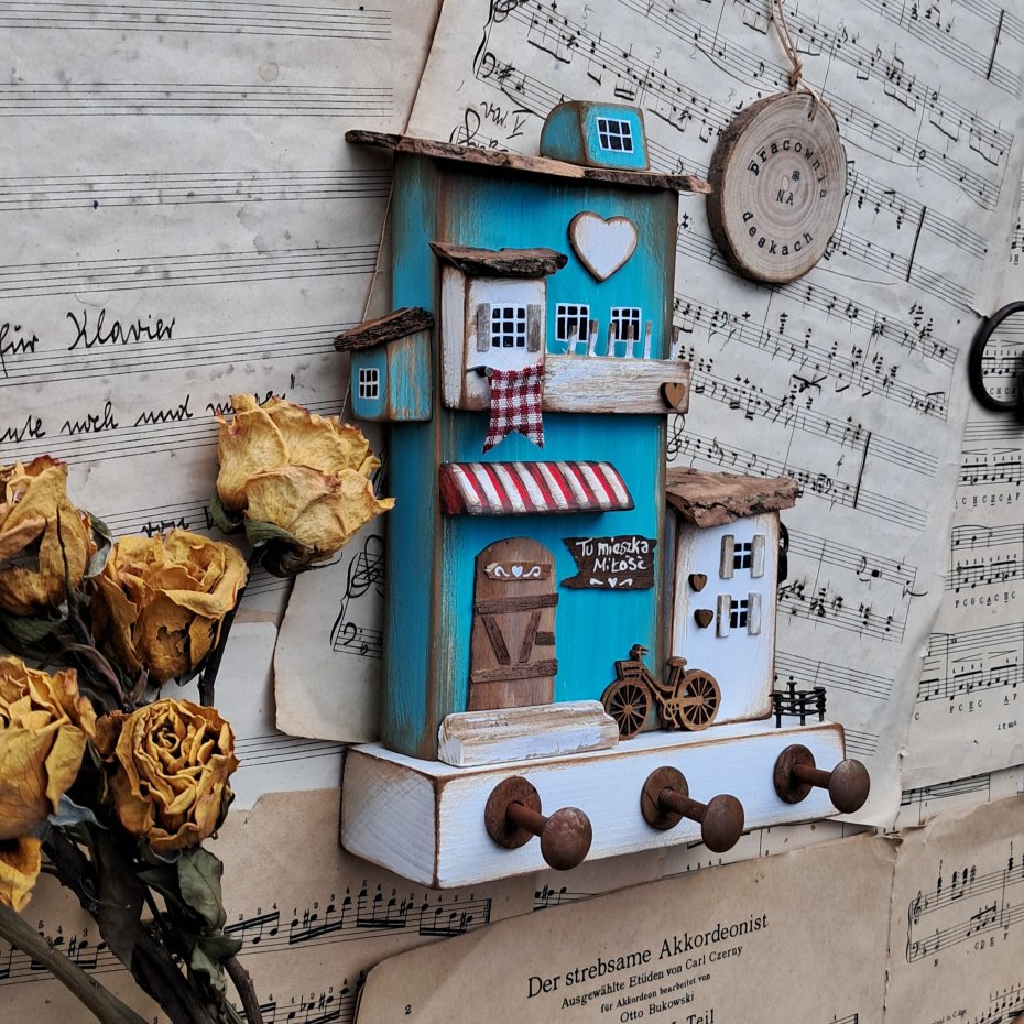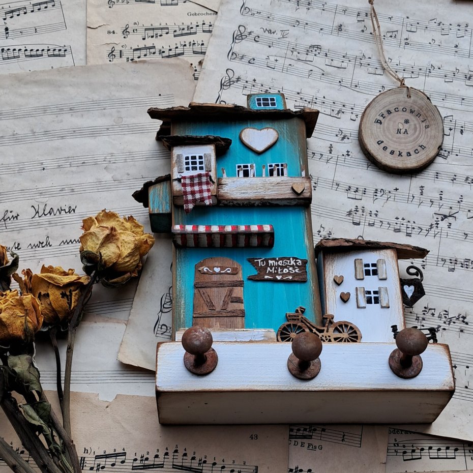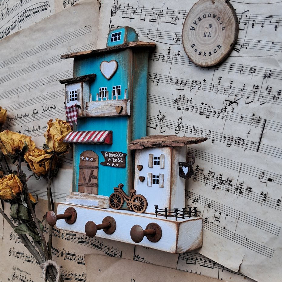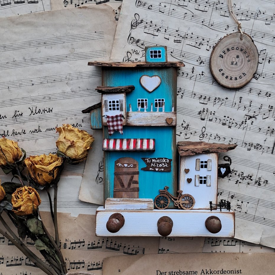 Dla wszystkich wielbicieli drewna i naturalnych dekoracji proponuję rustykany trójwymiarowy wieszak z domkami.