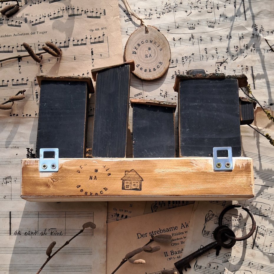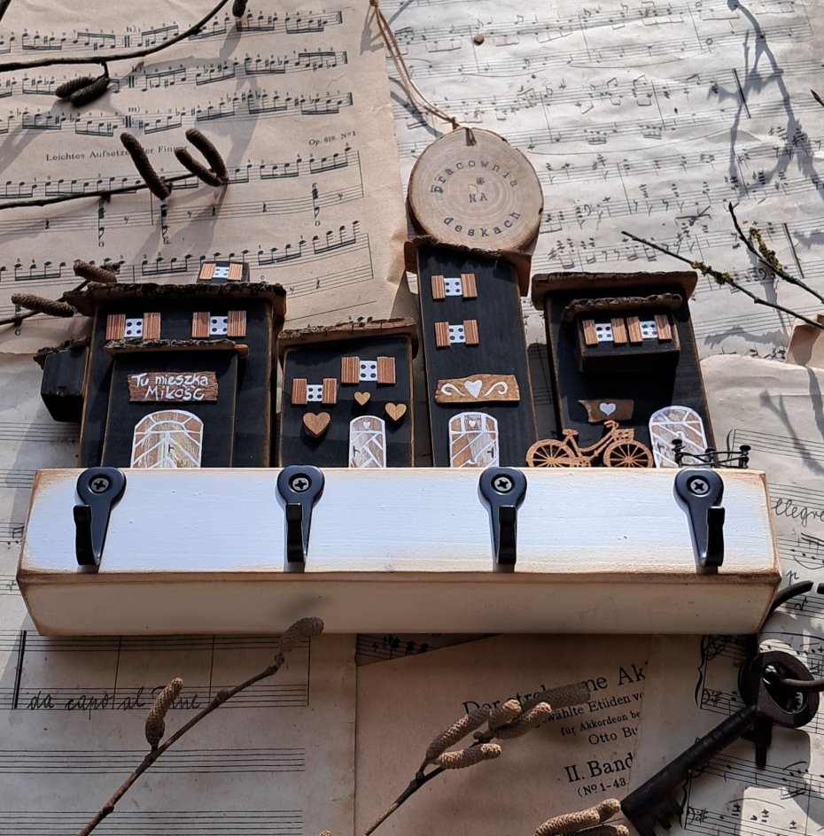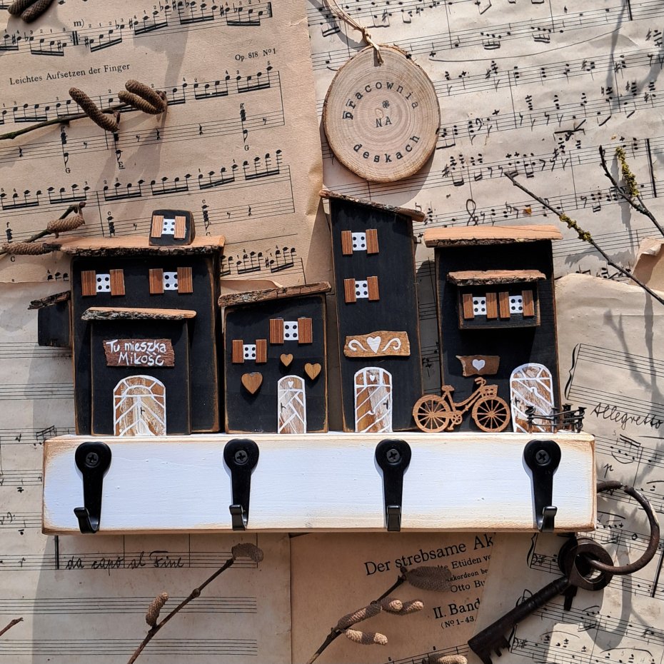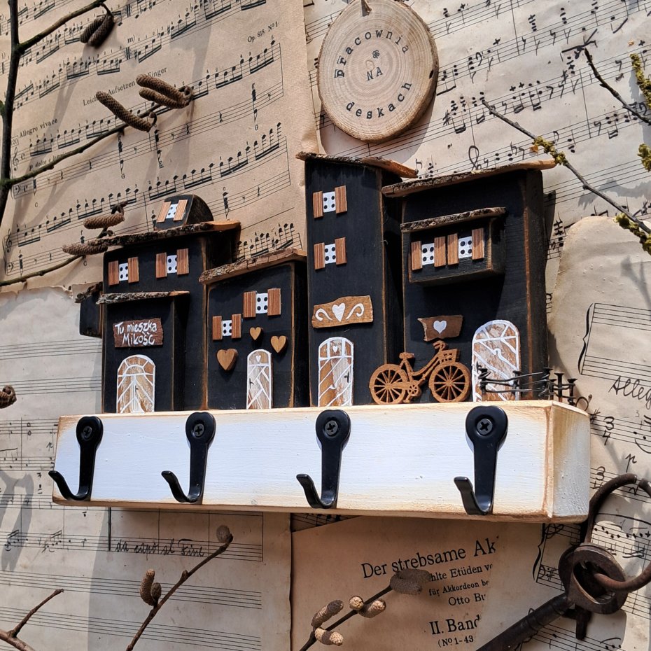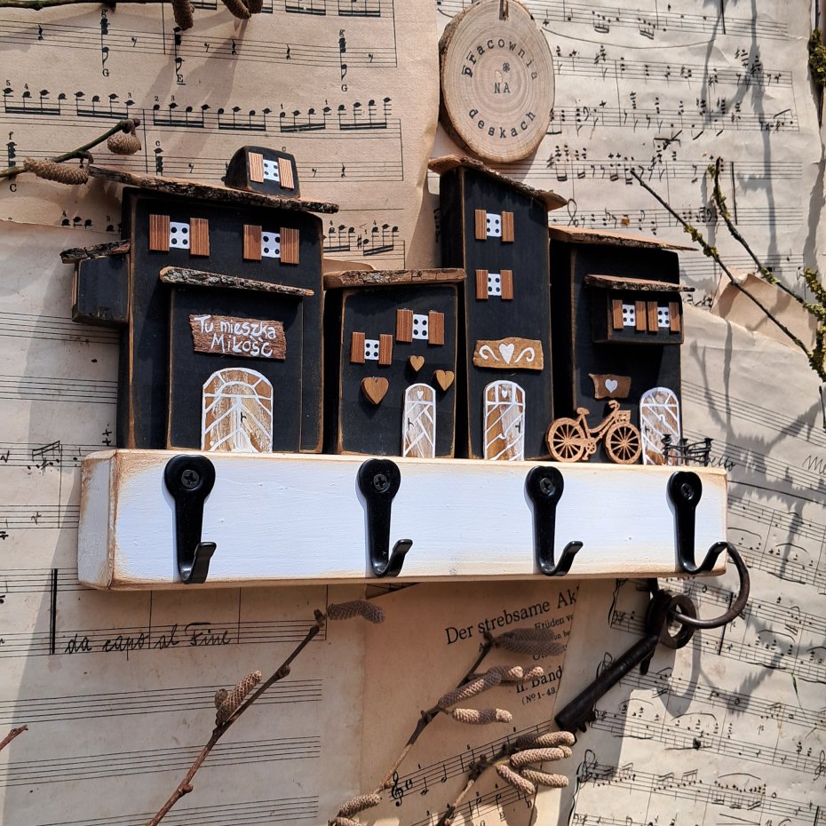 Wieszak z domkami w odcieniach czerni i bieli wykonany z drewna, każdy domek inny... ręcznie malowany, przytwierdzony do listwy z haczykami.
