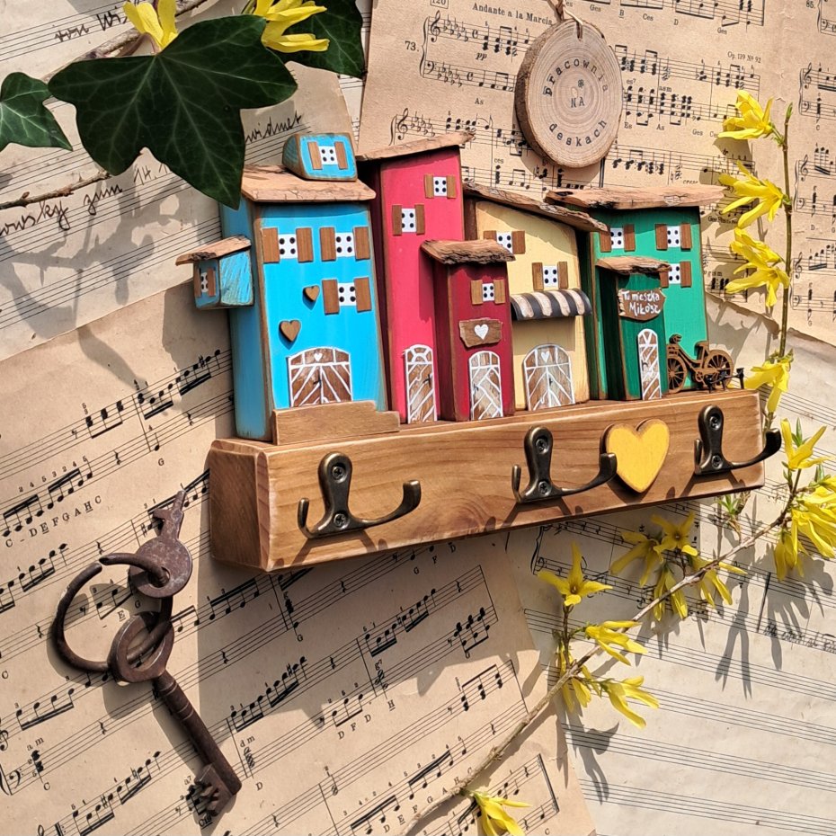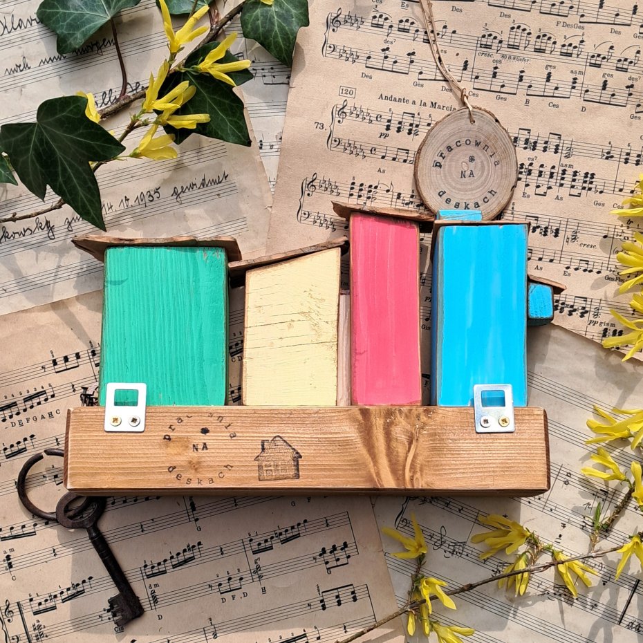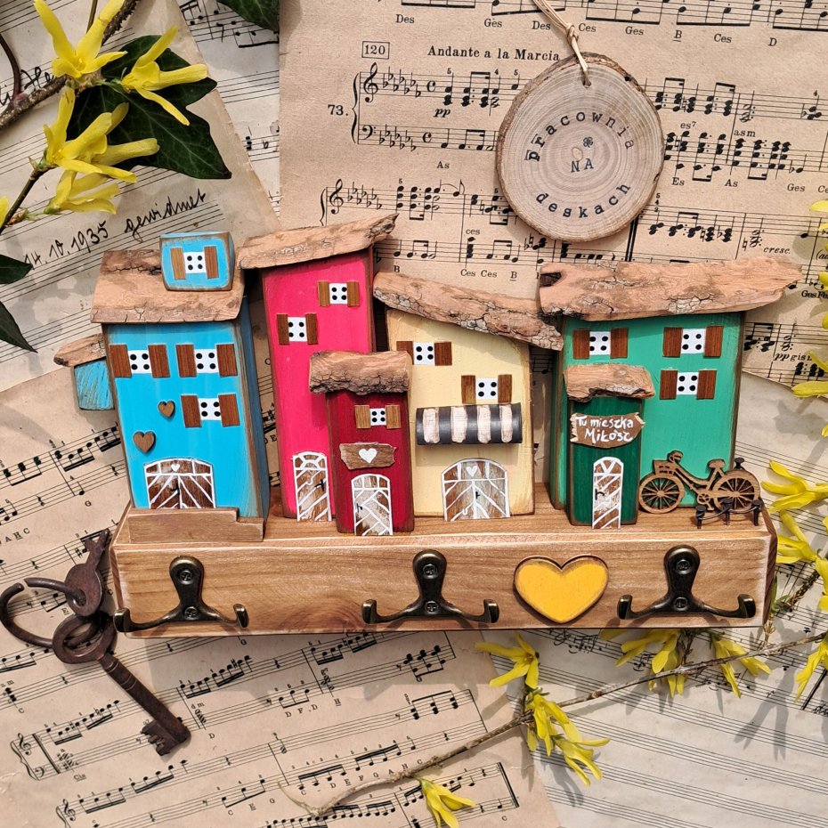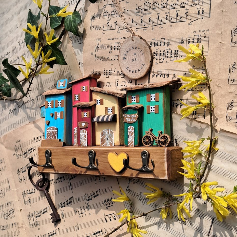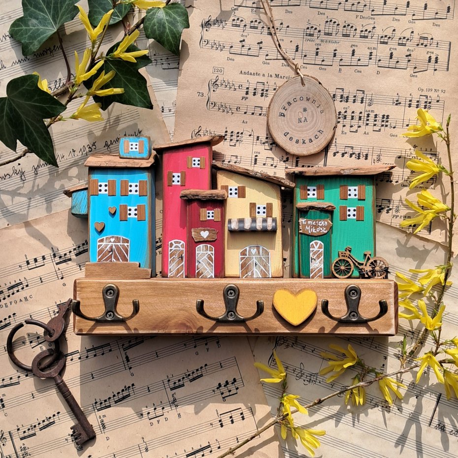 Wieszak z kolorowymi domkami z naturalnymi akcentami, wykonany z drewna.
