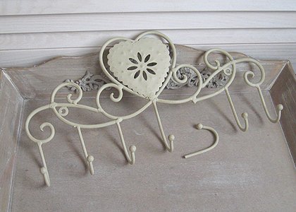 Piękny wieszak metalowy z sercem, kolor kremowy. Wieszak ma wyłamany jeden haczyk, stan taki jak na zdjęciu.