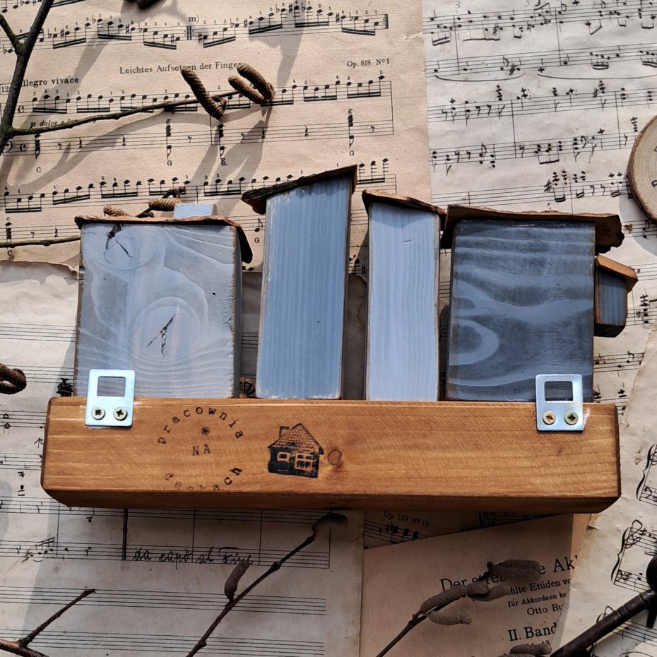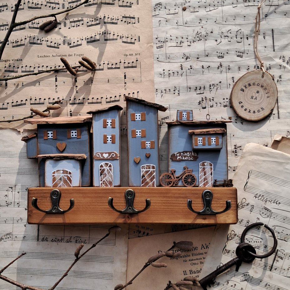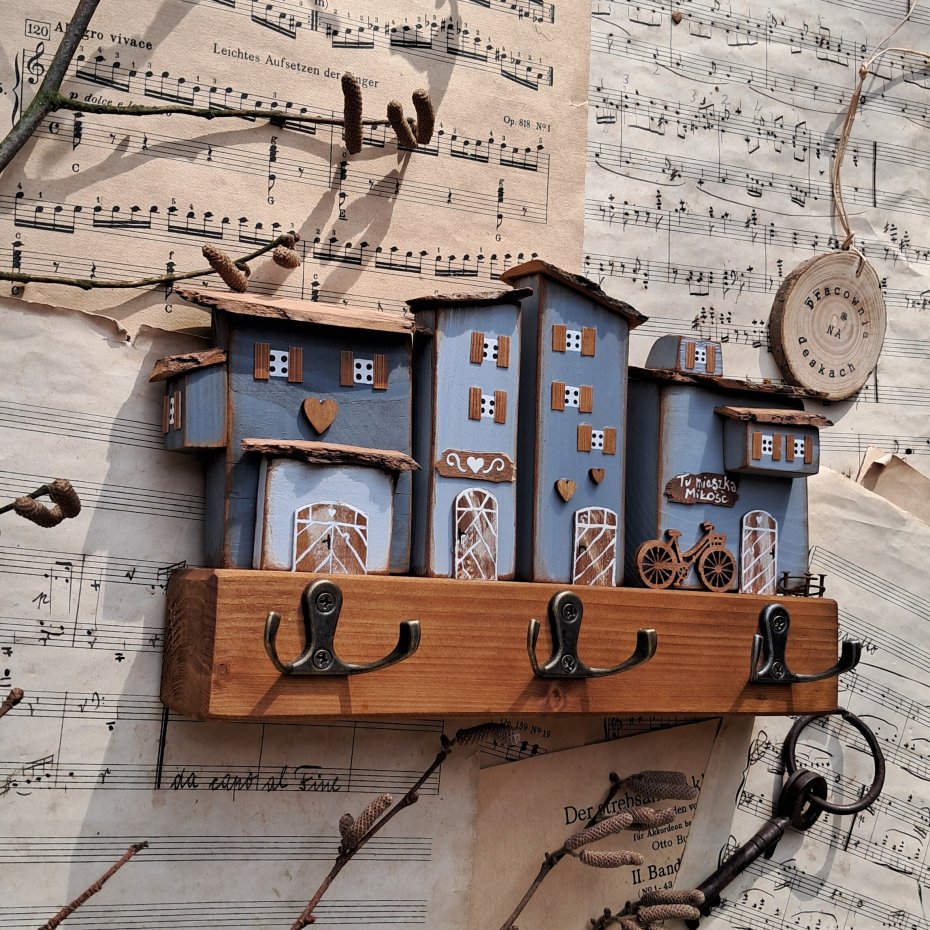 Wieszak z domkami w kolorze szarym z naturalnymi, przecierany, postarzany.