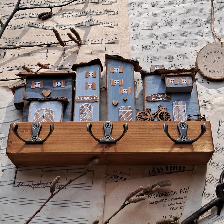 Wieszak wykonany z drewna. każdy domek inny... Ręcznie malowany, przytwierdzony do listwy z haczykami .