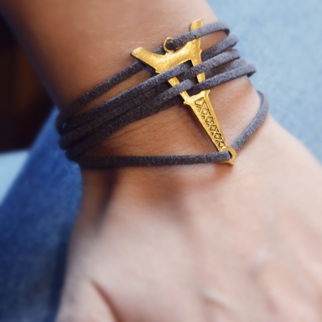 Bransoletka wykonana z szarego rzemyka oraz wieży eiffla i zapięcia w kolorze złotym. Oryginalna, świetnie się prezentuje!!!