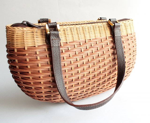 Fantazyjna torebka wykonana z plecionej wikliny. Posiada podszewkę. Produkt wygląda na nowy. Uchwyty wykonano w mojej ocenie ze skóry.