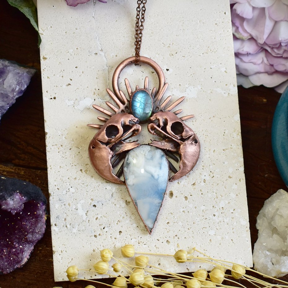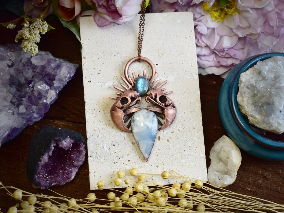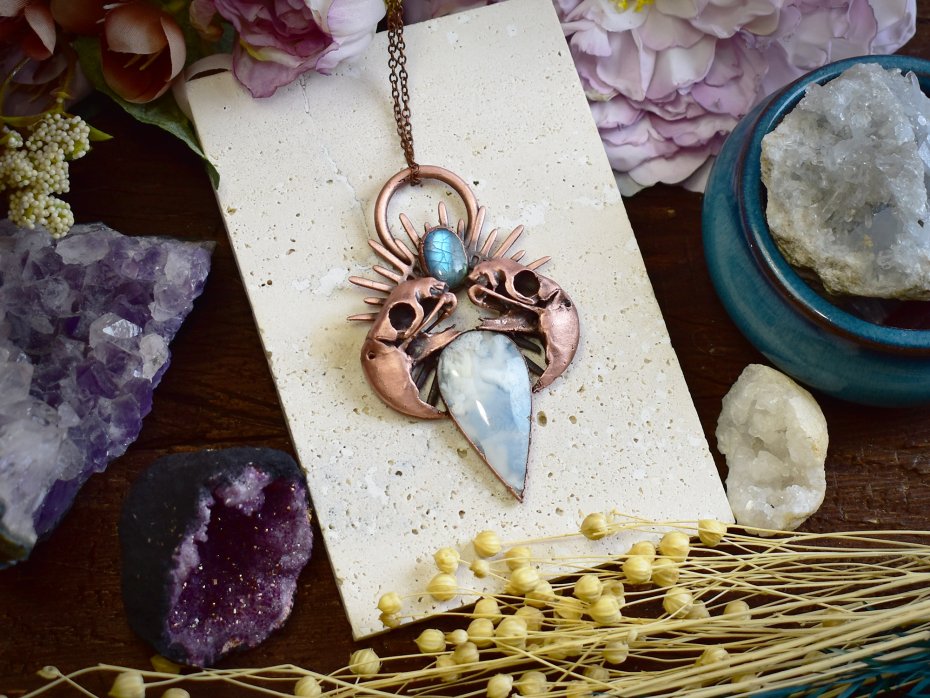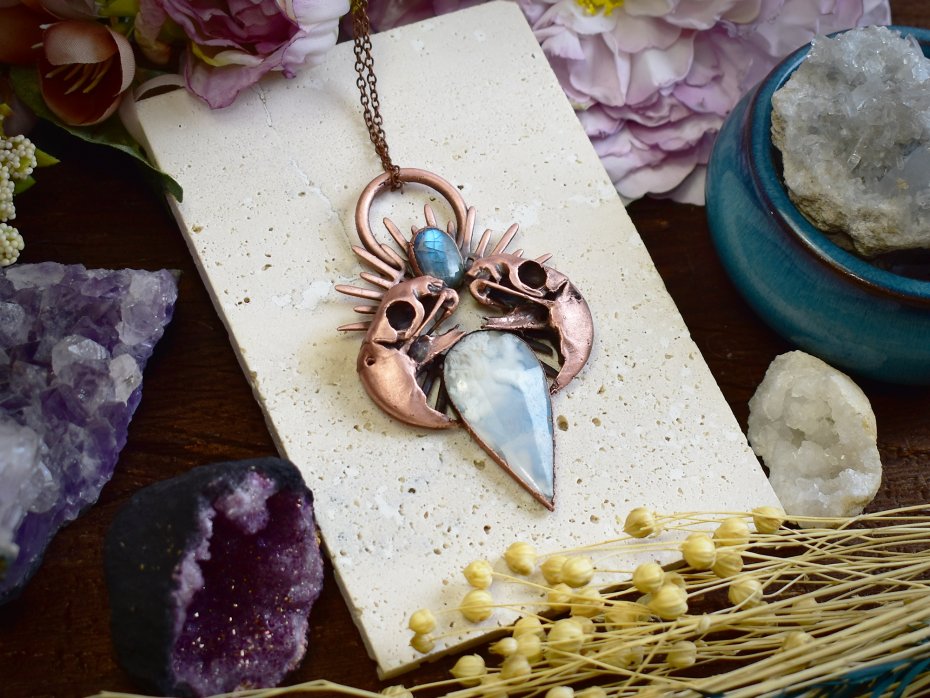 Elektroformowany wisiorek o wyrazistym, artystycznym charakterze, wykonany z agatu typu doublet w kształcie łezki oraz mniejszego labradorytu. Kształt agatu przypomina delikatną, miękką chmurkę, a jego biały kolor nadaje kompozycji lekkości i subtelnego uroku. Nad nim, pomiędzy dwiema czaszkami papug wykonanymi w technologii druku 3D i pokrytymi miedzią, umieszczony został labradoryt, przyciągający uwagę subtelnym, naturalnym połyskiem. Czaszki osadzone są w ozdobnej koronie, wprowadzając element symboliczny i lekko barokowej ornamentyki. Patynowana powierzchnia elektroformowanego metalu podkreśla detale i nadaje całości surowy, nieco mroczny charakter. To unikatowy wisiorek dla osób ceniących odważne projekty, artystyczną biżuterię i nieoczywiste zestawienia motywów.