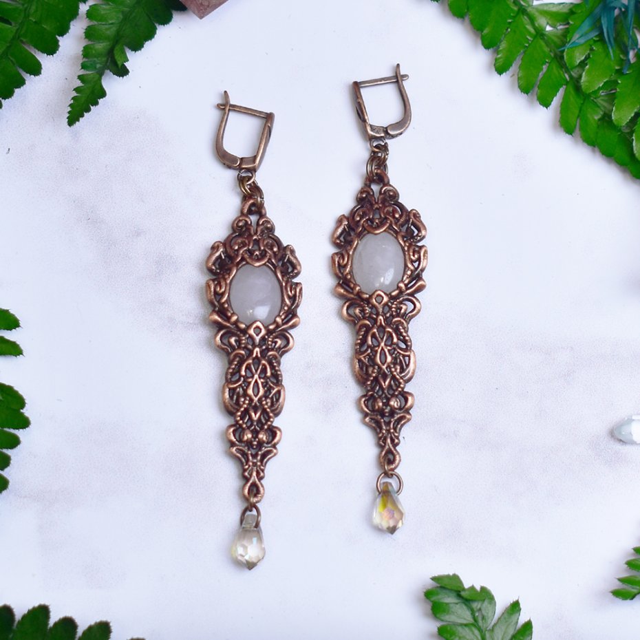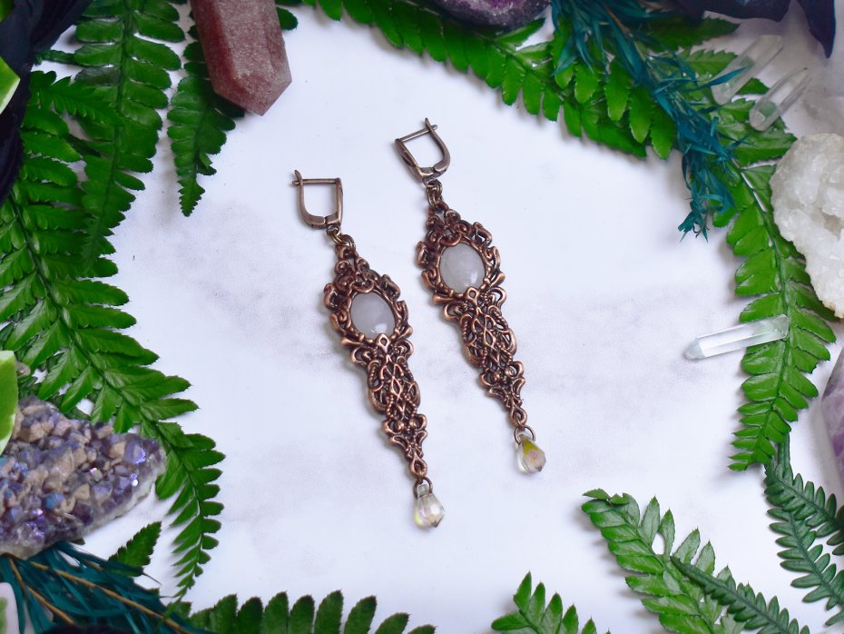 Miedziane kolczyki wykonane metodą elektroformowania, inspirowane wiktoriańską estetyką i bogactwem ornamentalnych detali. Misternie uformowana oprawa o dekoracyjnym, koronkowym charakterze podkreśla elegancką, wydłużoną formę kolczyków. Centralnym elementem są kaboszony z różowego kwarcu o delikatnej, mlecznoróżowej barwie, które nadają całości miękkości i subtelnego, romantycznego wyrazu. Całość dopełniają drobne, swobodnie poruszające się akcenty, dodające lekkości i finezji. Różowy kwarc kojarzony jest z harmonią i łagodnością, a jego połączenie z ciepłym odcieniem miedzi tworzy biżuterię o ponadczasowym, eleganckim charakterze. Kolczyki są propozycją dla osób ceniących rękodzieło, historyczne inspiracje i ozdoby o wyrafinowanym, kobiecym stylu.
