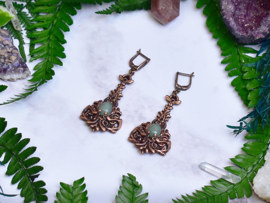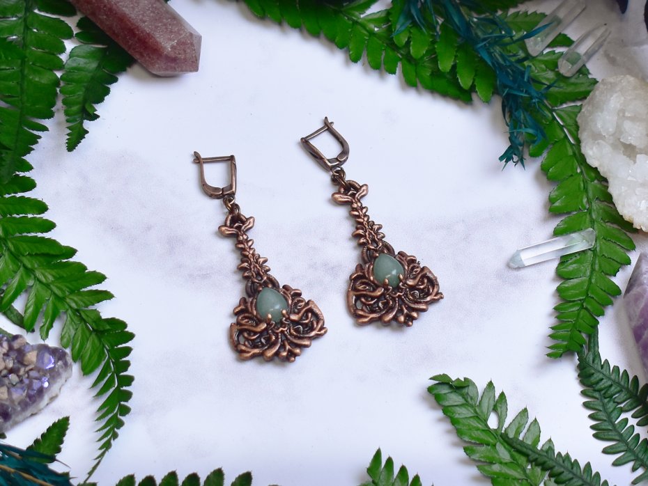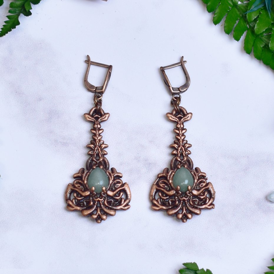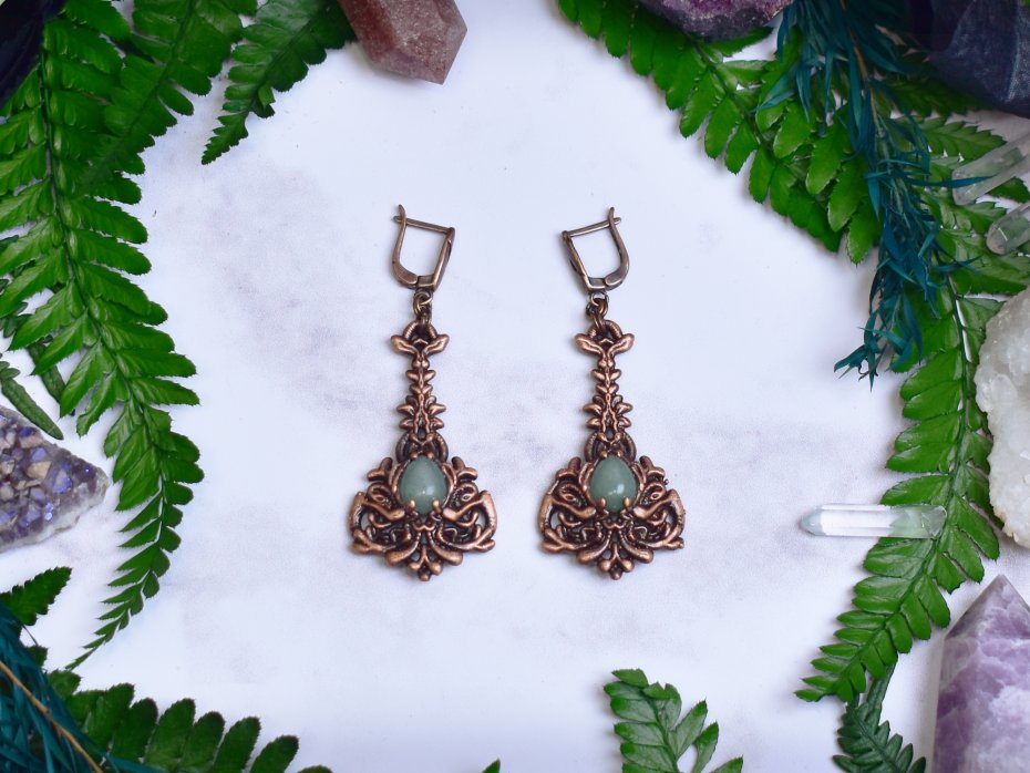 Miedziane kolczyki wykonane metodą elektroformowania, inspirowane wiktoriańskim stylem i ornamentalnym bogactwem dawnych form. Smukła, wydłużona sylwetka oraz misternie ukształtowane detale o roślinnym charakterze nadają im elegancki, dekoracyjny wyraz. Centralnym elementem są kaboszony z zielonego awenturynu o łagodnej, naturalnej barwie, które wprowadzają do kompozycji świeżość i spokojny ton. Ciepły odcień miedzi pięknie podkreśla kolor kamieni i wzmacnia klasyczny, lekko historyczny charakter kolczyków. Zielony awenturyn kojarzony jest z harmonią i równowagą, a całość tworzy biżuterię o ponadczasowym, wyrafinowanym stylu. Kolczyki będą idealnym wyborem dla osób ceniących rękodzieło, elegancję oraz biżuterię inspirowaną naturą i dawną estetyką.