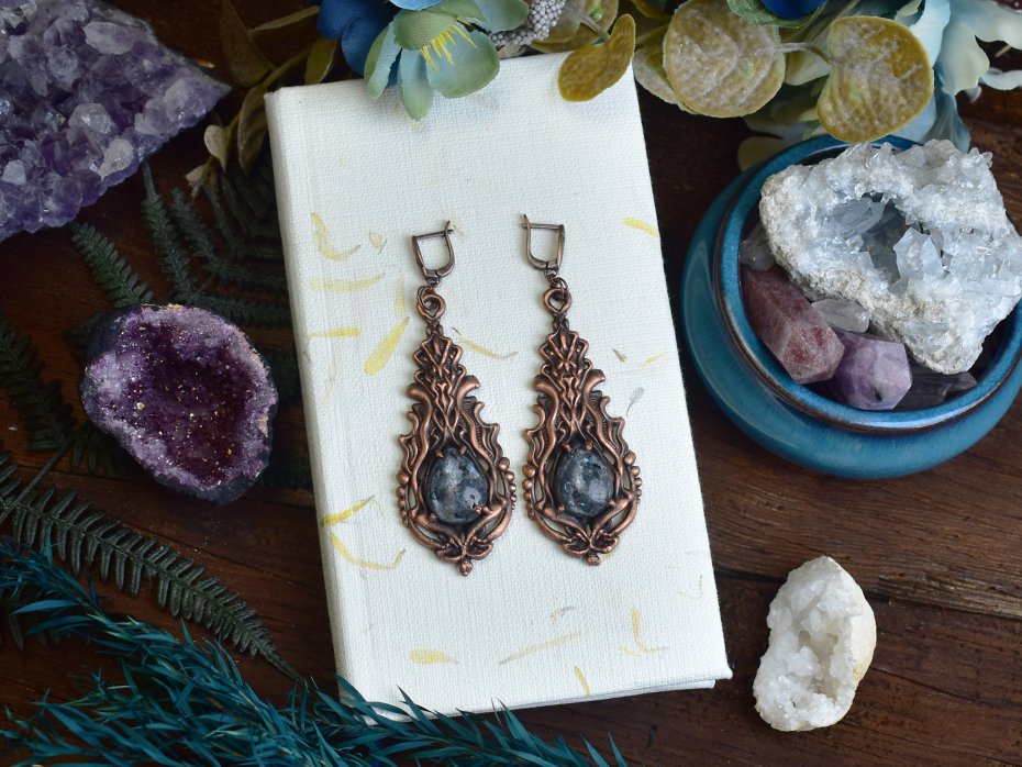 Tagi: #kolczyki miedziane, #kolczyki wiszące, #kolczyki z kamieniami, #wiszące kolczyki