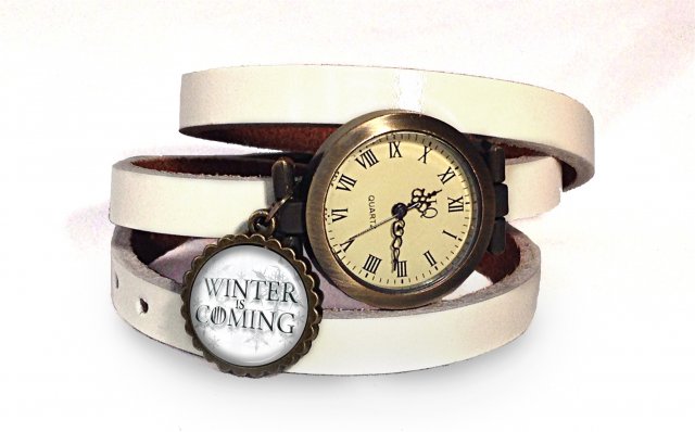 Zegarek ze skórzanym paskiem kilkakrotnie zakręcanym na ręku z ręcznie robioną zawieszką (kaboszonem).