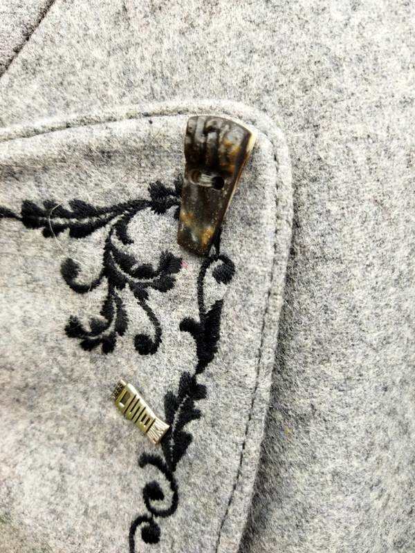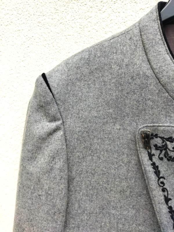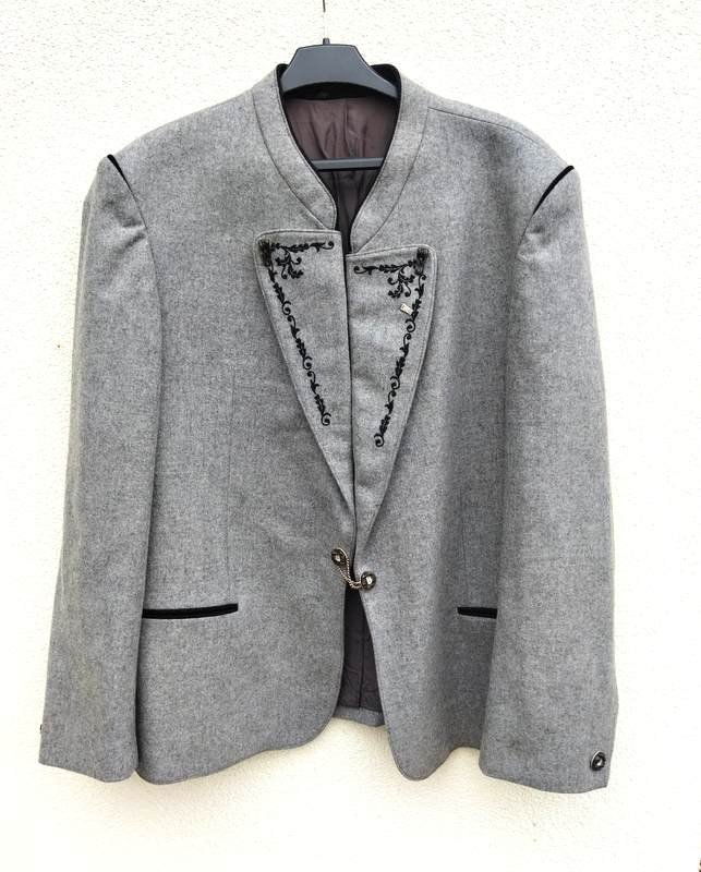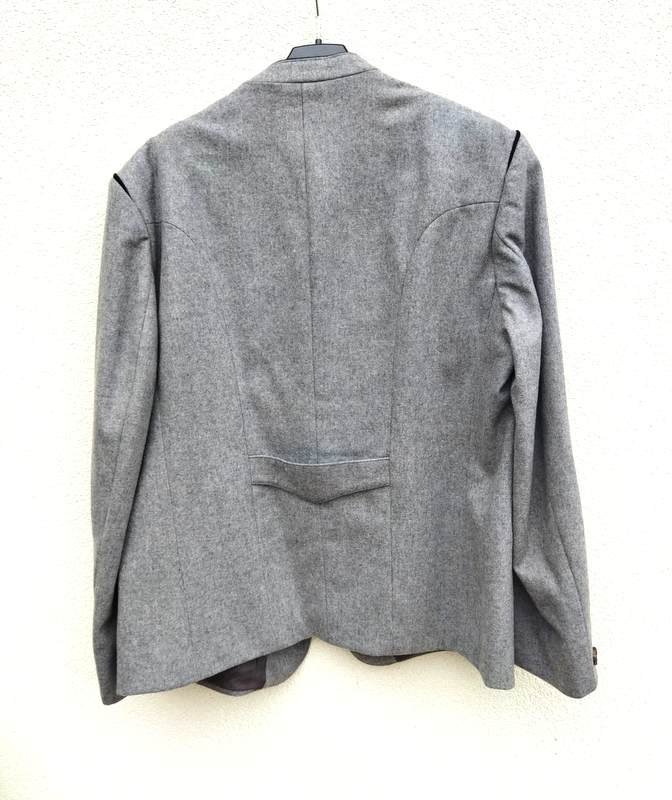 Marynarka z wełnianej tkaniny w jasnoszarym kolorze z czarnymi lamówkami , doskonale uszyta i starannie wykończona. Na stójce pod szyją z rewersami ozdobnie haftowanymi czarnymi nićmi , u dołu dwie wpuszczane kieszenie , w środkowej części tyłu ozdobna patka. Zapinana na dwa guziki połączone łańcuszkiem. Na wiskozowej podszewce.