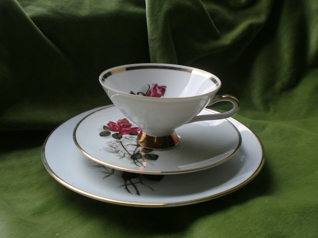 Porcelanowy zestaw śniadaniowy cenionej manufaktury Winterling, sygnowany. Kolor biały, złocony na brzegach, zdobiony pąsowa różą. Niezwykle sentymentalny i kobiecy.
