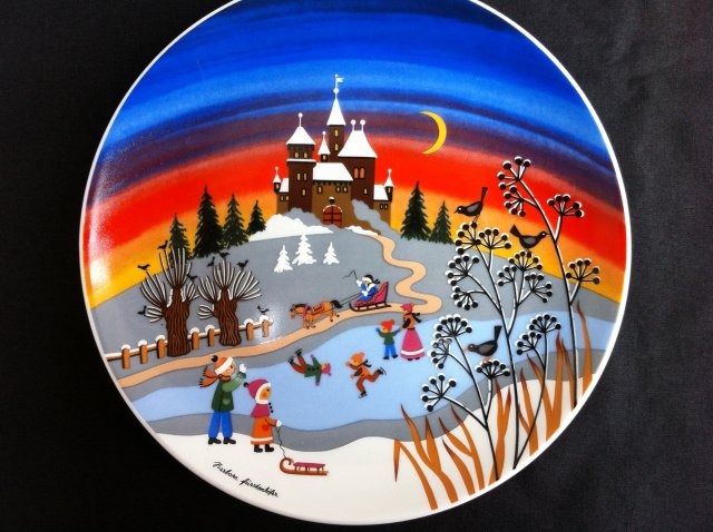 Porcelanowy talerz z jakościową, satynową malaturą wg autorstwa Barbary Furstenhofer. Sygnowany bawarskim Winterling. Fantastyczna barwność i artyzm graficznego projektu. Zimowy, ale całorocznie atrakcyjny :)) 19,5 x 2,5 cm. Stan zachowania bardzo dobry minus jedna rysa na niebieskościach nieba.
