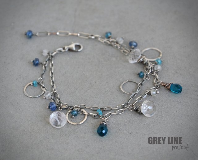 Bransoletka wykonana z oksydowanego srebra próby 925 oraz naturalnych minerałów w odcieniach niebieskiego : kryształu górskiego w formie fasetowanych cebulek, oponek zielonego ametystu, kwarcu teal blue w formie łezki, oponek niebieskich kyanitów i apatytu w dwóch odcieniach.