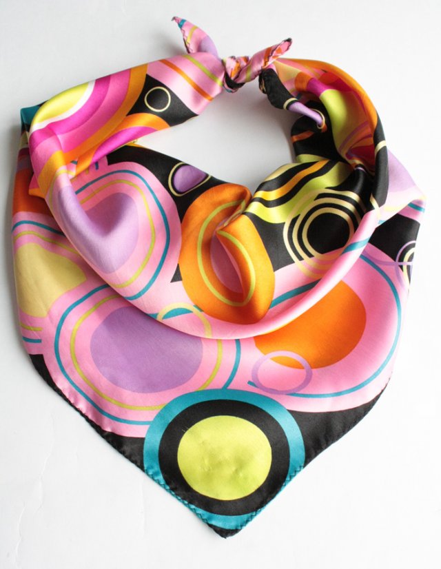 Efektowna chusta w wielobarwne koła. Materiał to prawdopodobnie jedwab naturalny lub syntetyczny.