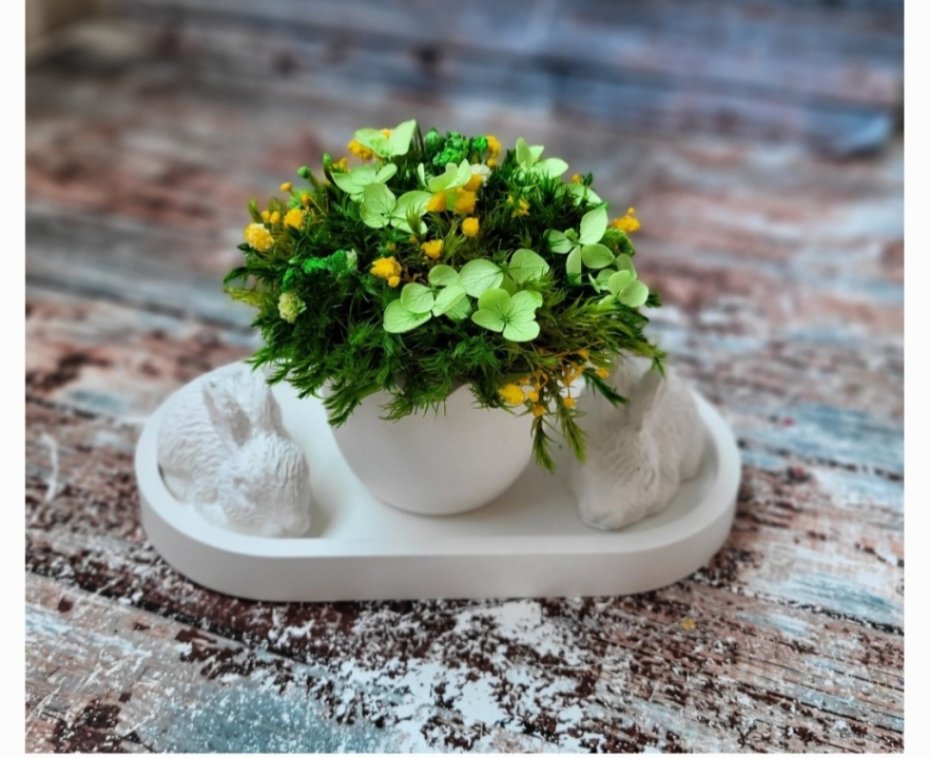 Po bokach znajdują się dwie figurki króliczków, które nie tylko dodają wyjątkowego uroku, ale także symbolizują dostatek, pomyślność i rodzinne ciepło. Cała kompozycja umieszczona jest na starannie wykonanej gipsowej podstawce, co nadaje jej wykończenie i sprawia, że zestaw jest idealny do dekoracji wnętrza.