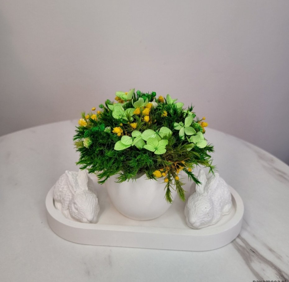 Centralnym elementem jest śnieżnobiały wazon w kształcie jajka, symbolizujący początek nowego życia, przebudzenie natury i czystość myśli. W jego wnętrzu znajduje się kompozycja z delikatnego stabilizowanego mchu i suszonych kwiatów, które niczym oddech wiosny wprowadzają uczucie świeżości i lekkości.