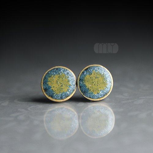Ceramiczne kolczyki w formie sztyftów, ręcznie wykonane z delikatnej gliny kamionkowej, jednostronnie szkliwione błękitno szarym i zielonkawym szkliwem z efektem plamek, na antyalergicznych sztyftach w kolorze srebrnym.Średnica ok. 9mm.Polecam