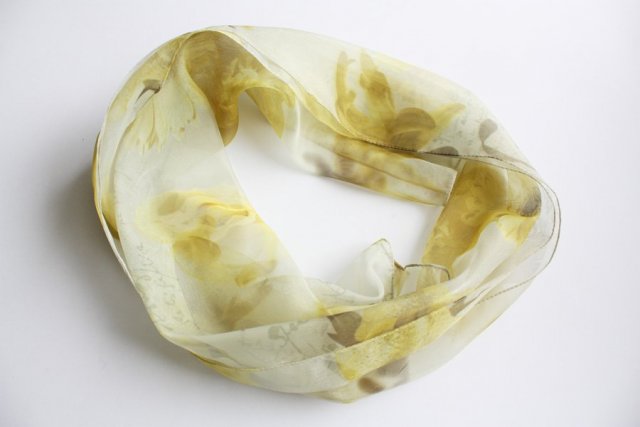 Zwiewny, cienki szal w roślinne motywy w odcieniach limonki. Piękny dodatek pełen wiosennego słońca.