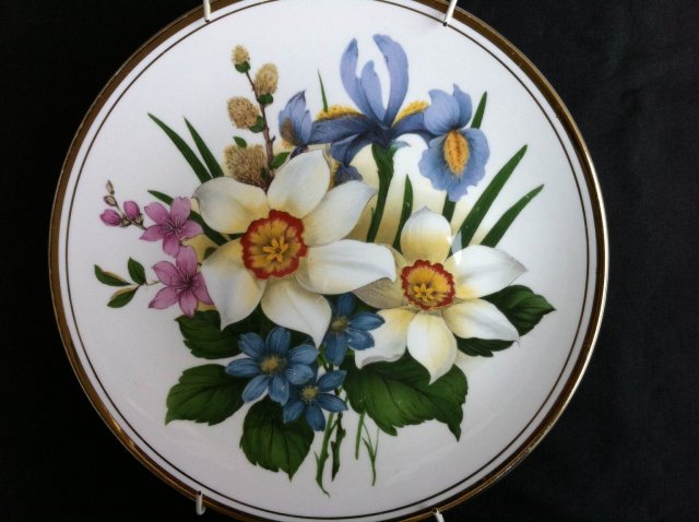 Jedwabiście porcelanowy, na błyszcząco szkliwiony talerz z piękną kwiatową malaturą. Na rancie złocony, sygnowany koronnym Edwardian :) 21,5 x 2 cm. Z tyłu profesjonalny uchwyt do powieszenia. Stan zachowania dobry.