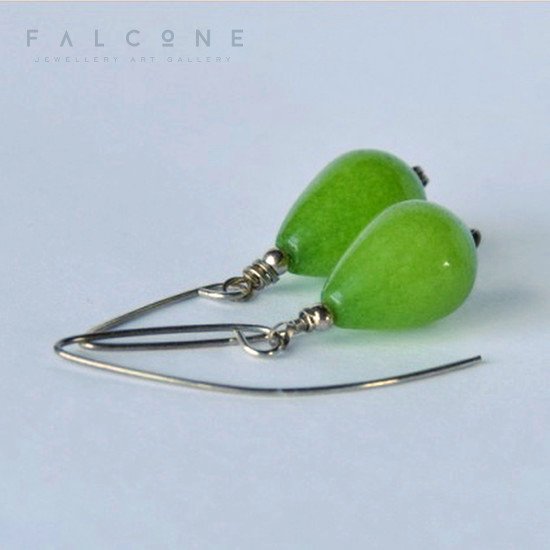 Kolczyki z jadeitów w kształcie kropli, o barwie świeżej, soczystej zieleni. Kolor nadziei i optymizmu. Jasny i wiosenny, ale nie jaskrawy. Oprawione w całości w jasne srerbo 925. Długość kolczyków to ok. 4 cm.