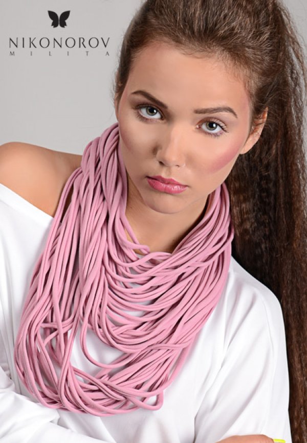 Oryginalny naszyjnik-szal. Ręcznie wykonany z pasów naturalnej dzianiny w kolorze pudrowego różu.