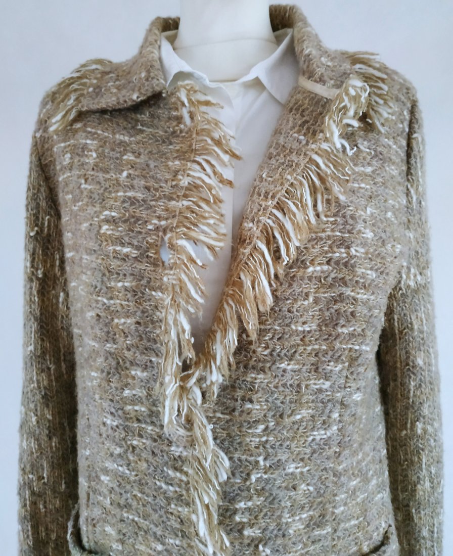 kolor ciepły beż z jasnymi ecru nitkami.Tkanina a'la tweed, chanelka. Kołnierz, poły oraz wykończenie rękawów - postrzępione. Z przodu dwie kieszonki. Rękawy wewnątrz mają wszytą śliską wyściółkę, co ułatwia zakładanie.Stylowy o luźnym charakterze.