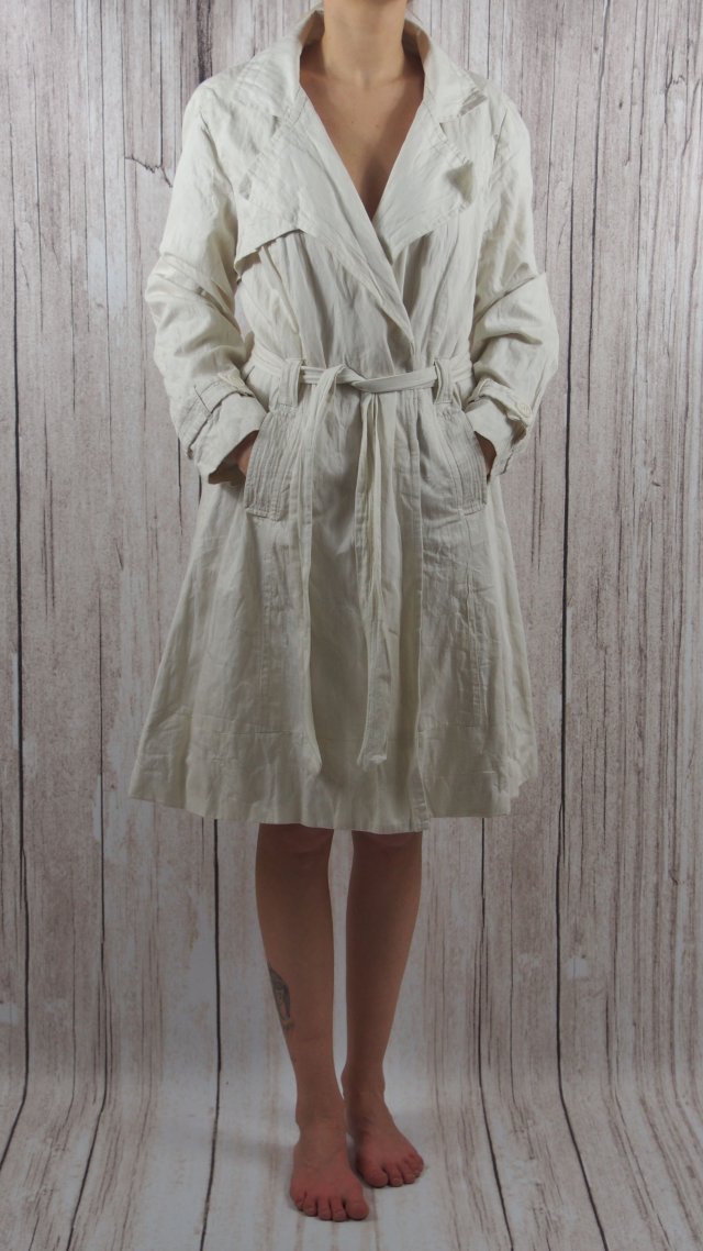 Świetny wiosenny płaszcz elegancki, szykowny. Bawełna 95%, metaliczne włókno 5%, podszewka bawełniana, na rękawach poliestrowa.