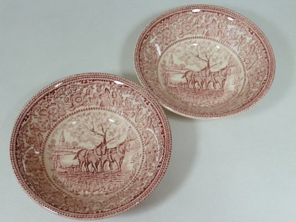 Piękne dwie salaterki angielskiej wytwórni Ironstone. Porcelana w kolorze ecru a malatura delikatna czerwona. Pod spodem sygnatura tłoczona. Wewnątrz wzór wiejski przedstawiający prace polowe na wsi odbywające się wiosną. Pod wzorem napis Spring on the home farm. Stan bardzo dobry.