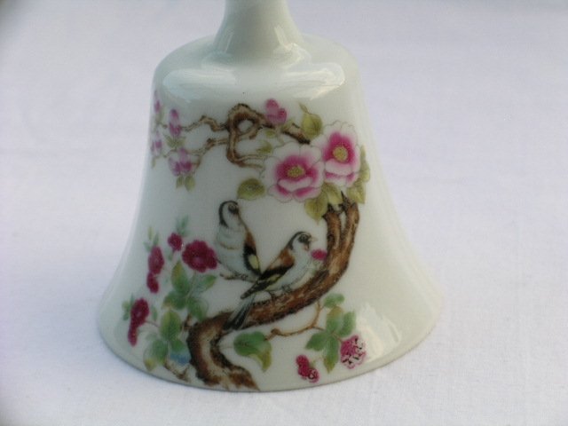 Porcelanowy dzwonek z wiosennym, kwiatowo-ptasim zdobieniem w orientalnej stylistyce. Przyjemnie dźwięczy. Złocenie na rączce, delikatne ryflowanie i błyszczące wykończenie. 6,5 x 9,5 cm. Stan zachowania bardzo dobry.