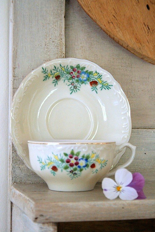 Uroczy porcelanowy zestaw...talerzyk z filiżanką...z uroczymi kwiatuszkami. Na obrzeżach delikatny relief.