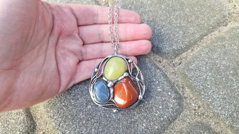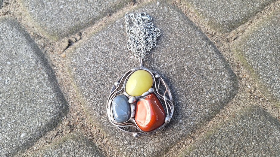Wisiorek wykonany z miedzi, cyny, jaspisu, agatu i jadeitu. Wymiary ok. 5 na 5 cm. Zawieszony na łańcuszku o długości ok. 50 cm.