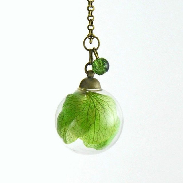 Wykonany jest ze szklanej formy, dodatków w kolorze antycznego złota oraz prawdziwych listków ( hortensja)