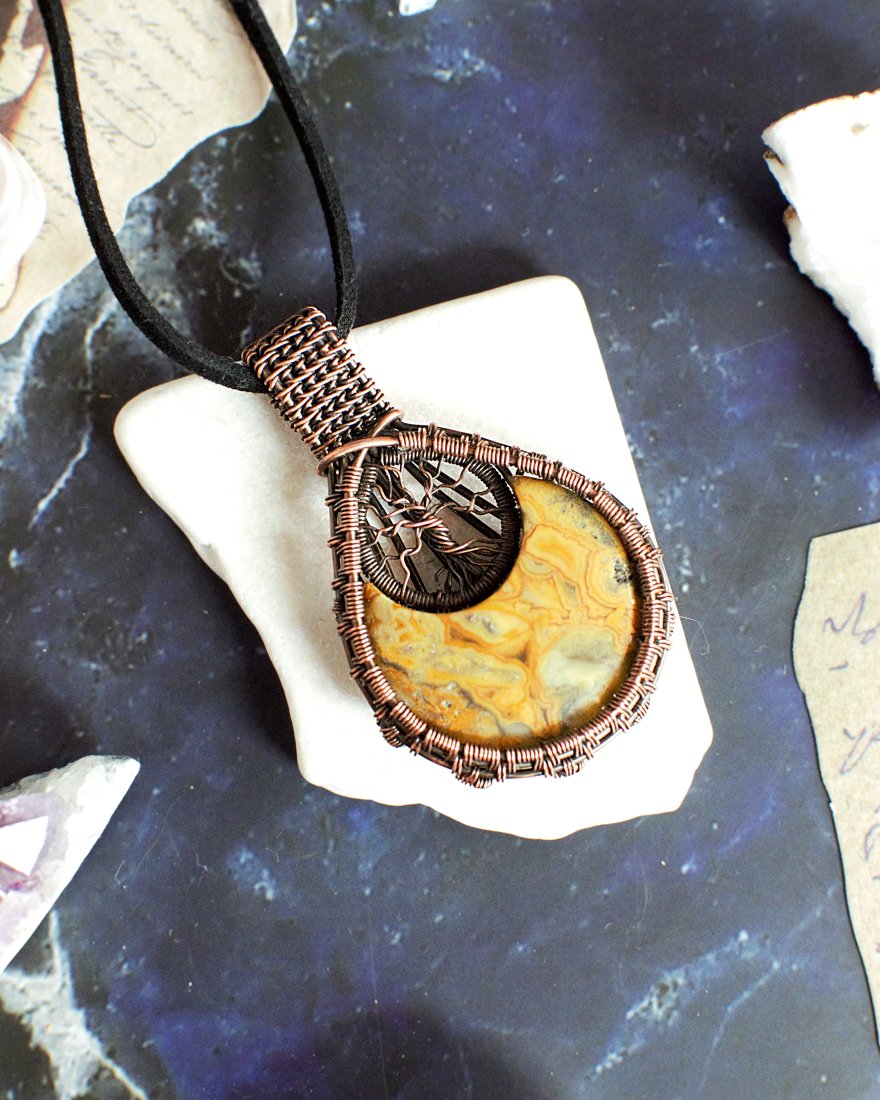 Przepiękny wisior ręcznie wykonany z użyciem agatu koronkowego i naturalnej miedzi.