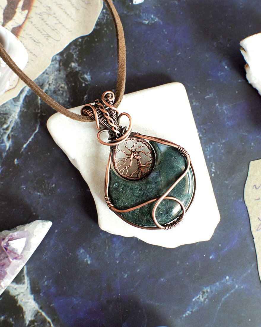 Przepiękny wisior ręcznie wykonany z użyciem agatu mszystego i naturalnej miedzi.