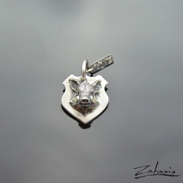 Wisior w kształcie głowy dzika, umieszczonej na ozdobnej tarczy. Wykonany ręcznie w całości ze srebra 925. Żłobienia i detale tworzone pod lupą.