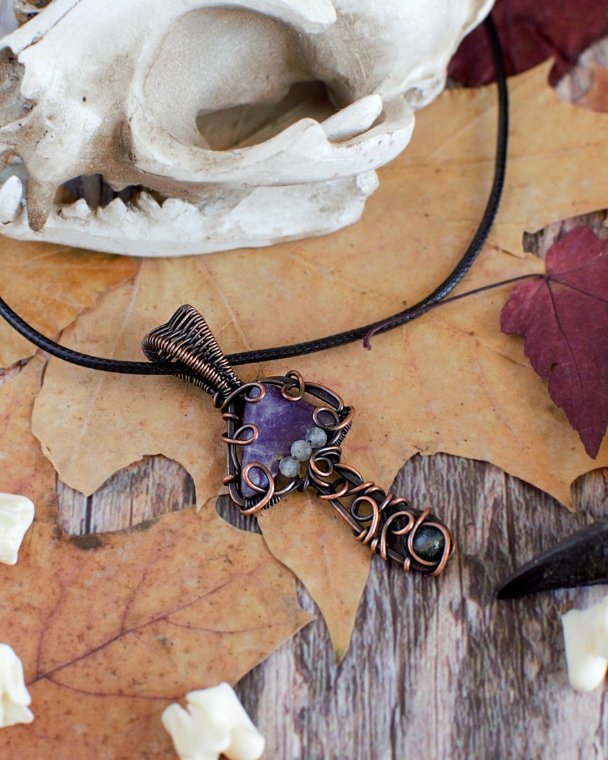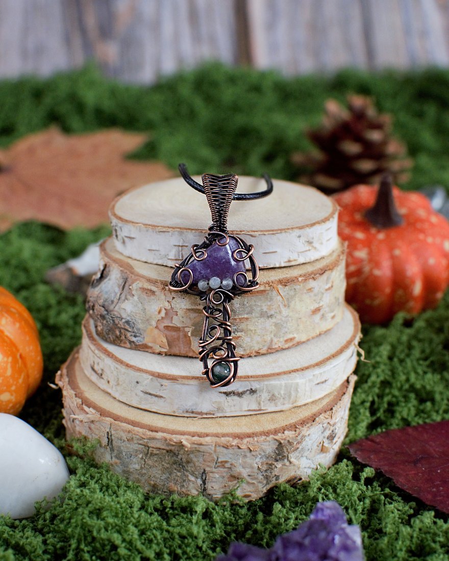 Przepiękny wisior ręcznie wykonany z użyciem ametystu, labradorytu, agatu mszystego i naturalnej miedzi.