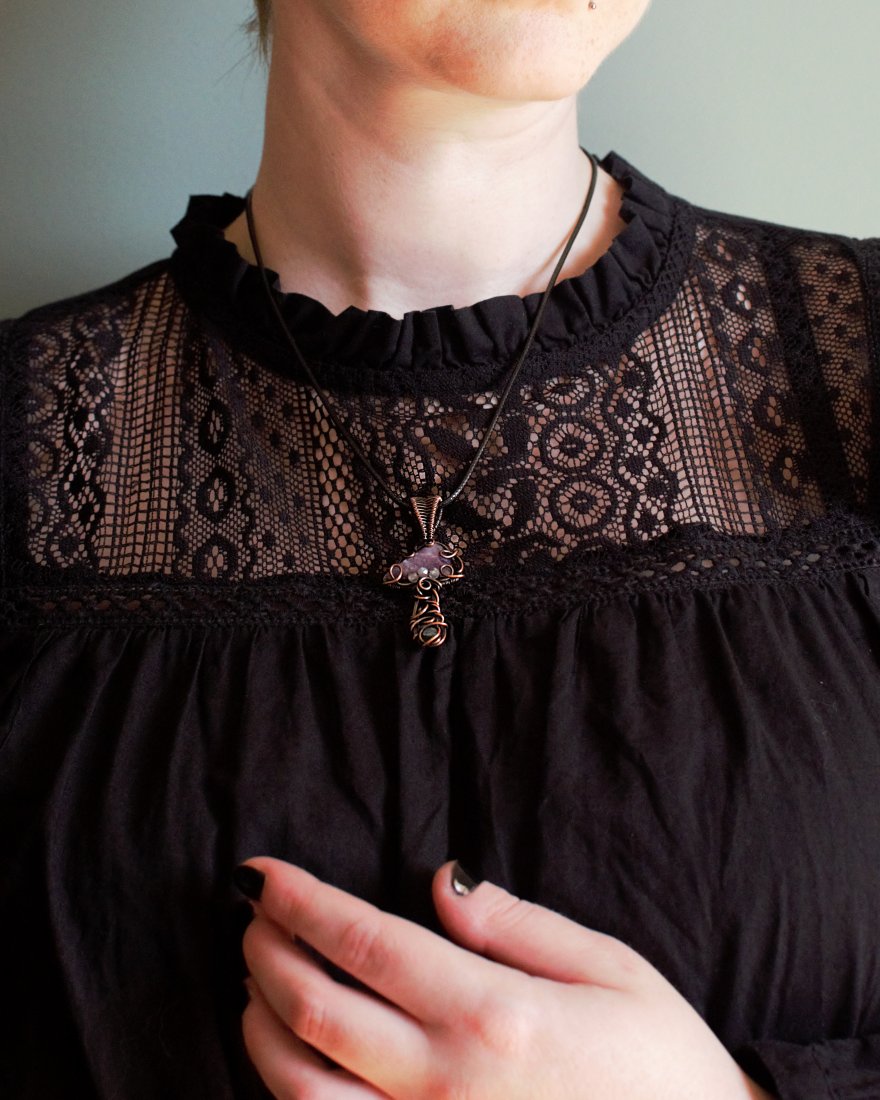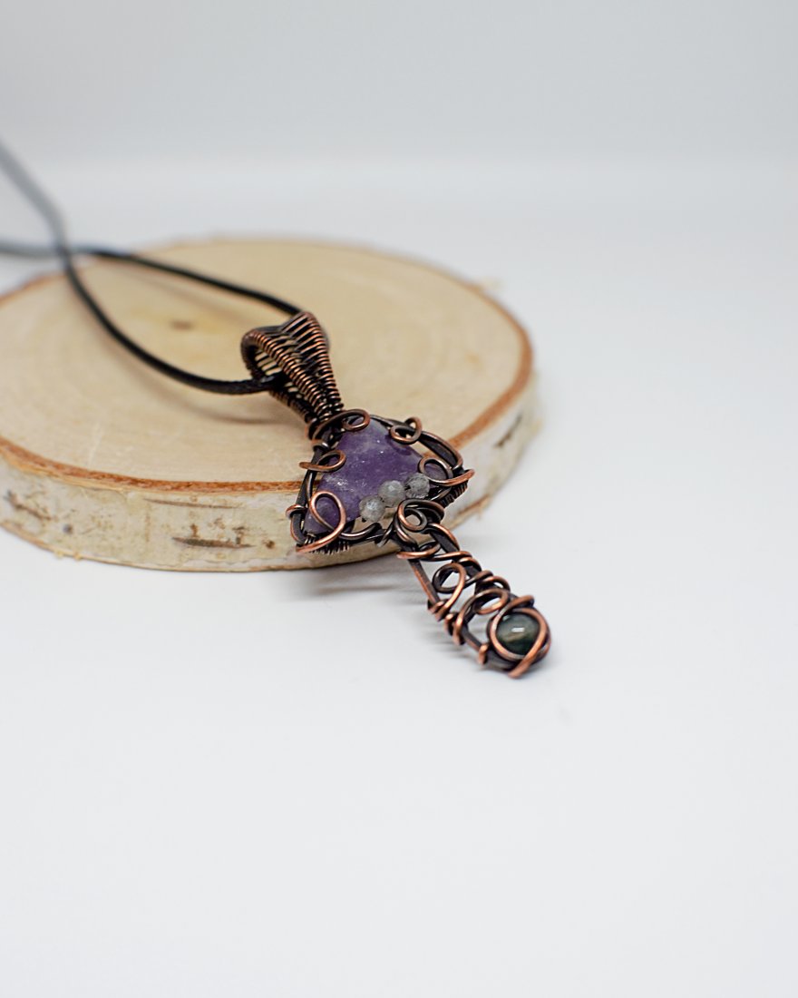 Materiały użyte: drut jubilerski miedziany, ametyst, labradoryt, agat mszysty.