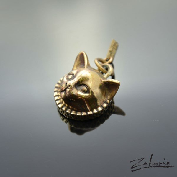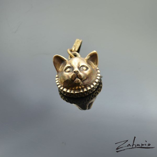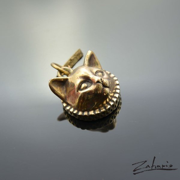 Wisior przedstawiający głowę kota wykonany ręcznie z brązu. Doskonała jubilerska robota doprawiona szacunkiem i czułością. Te wibrysy, ten uśmiech pod nosem, doskonałość rysów, miękkość futerka z metalu! To autorski projekt Zahario, który na co dzień ma okazję obcować z kocią naturą. Jej kwintesencję udało mu się zamknąć w maleńkiej zawieszce.