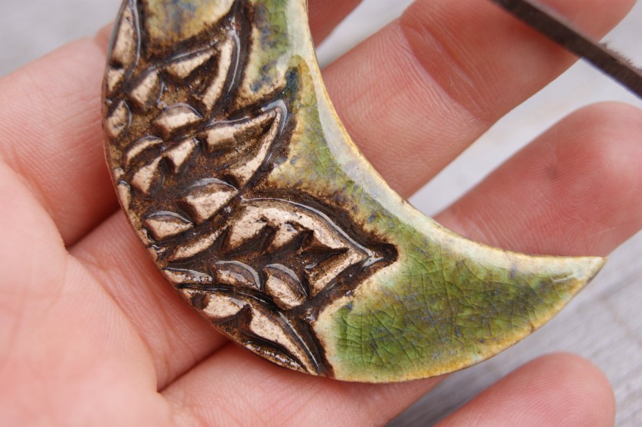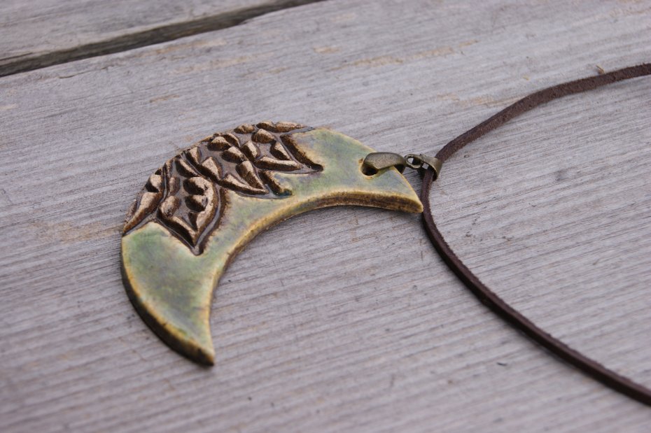 Ręcznie robiony ceramiczny wisior z ornamentem w kształcie księżyca, pokryty ślicznym zielonym błyszczącym szkliwem. Egzemplarz pojedynczy. Do wisiora dołączona jest krawatka i skórzany rzemień.