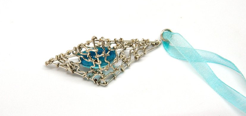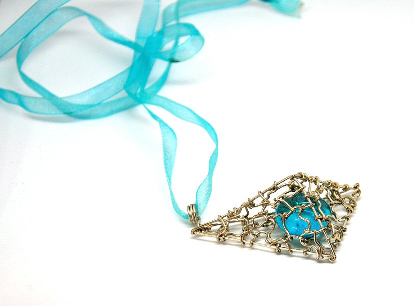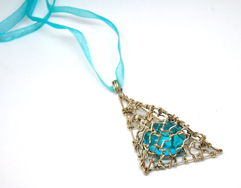 Naszyjnik, misternie pleciony z posrebrzanego drutu. W kształcie niesymetrycznego ostrosłupa, w środku znajduje się turkusowy, szklany kaboszon.