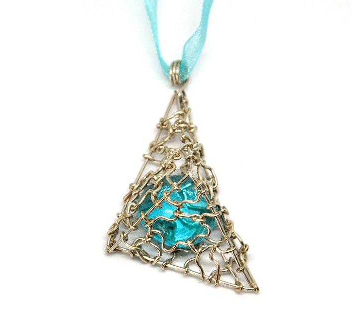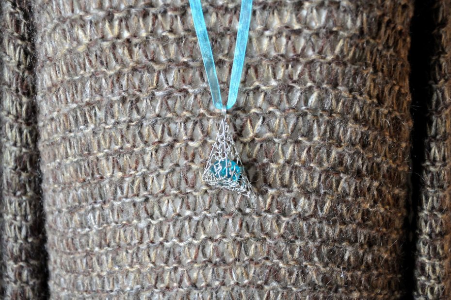 Naszyjnik, misternie pleciony z posrebrzanego drutu. W kształcie niesymetrycznego ostrosłupa, w środku znajduje się turkusowy, szklany kaboszon.