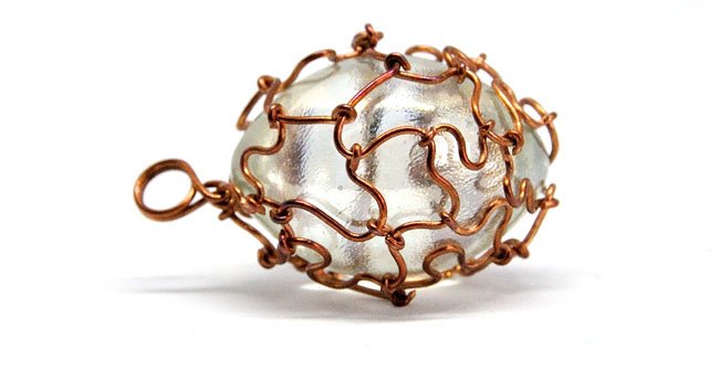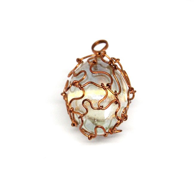 Spore, szklane jajko wykonane z przejrzystego (odrobinę zielonkawego), nieco opalizującego szkła. Opleciony misternie miedzianym drutem. Posiada oczko, przez które można przewiesić łańcuszek, wstążkę czy rzemyk.