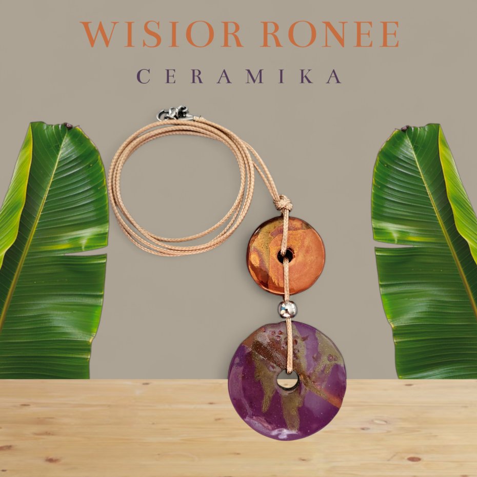 Elementy ceramiczne tworzące wisior zostały wplecione w sznureczki woskowane. Tak powstały naszyjnik z ceramicznym wisiorkiem ma długość ok. 78cm + wisior ok. 9cm. Wykończony jest zapięciem ze stali szlachetnej (zapinany jest na karabińczyk), choć swobodnie można go założyć przez głowę bez potrzeby rozpinania. Przy zapięciu znajduje się łańcuszek regulacyjny dający możliwość wydłużenia naszyjnika o dodatkowe kilka cm (max. 5cm).