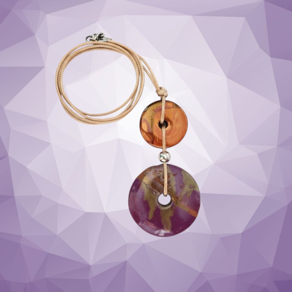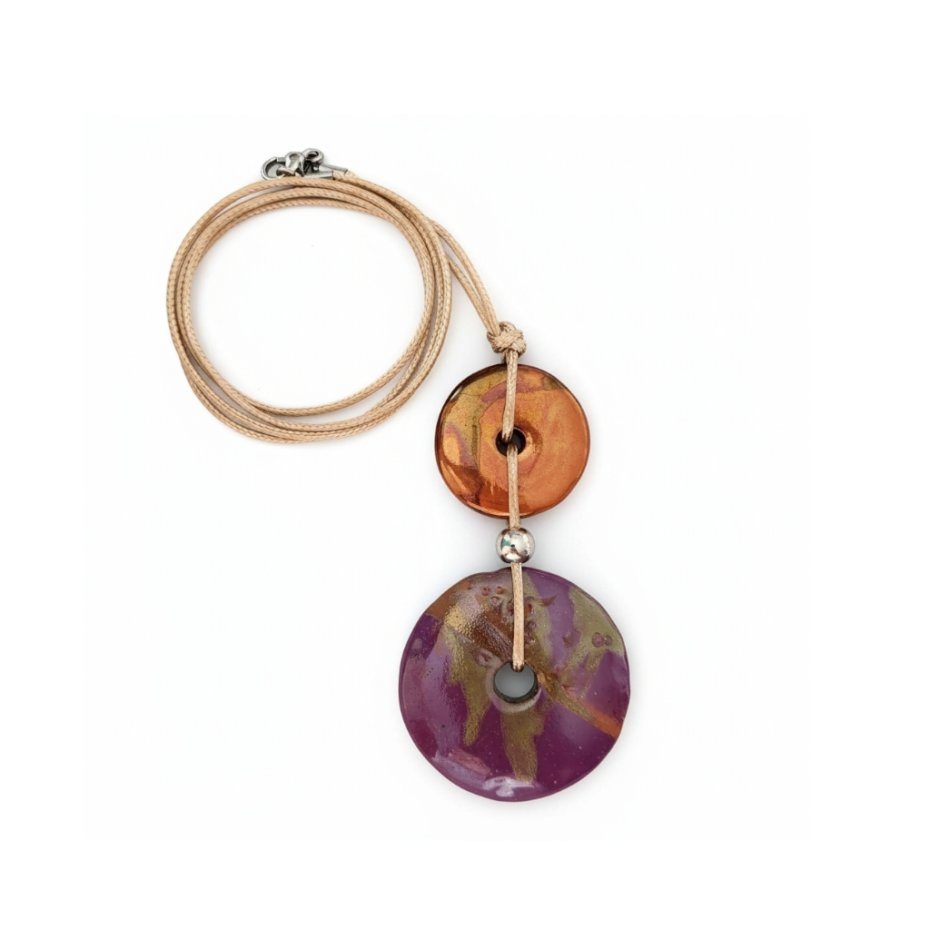 Wisior wykonany z dwóch, płaskich, okrągłych, szkliwionych elementów ceramicznych (ceramika grecka). Każdy z nich został wykonany ręcznie - jest jedyny w swoim rodzaju i posiada drobne niedoskonałości świadczące o jego manufakturowym pochodzeniu). Mniejsze koło ma średnicę ok. 3cm, zaś większe ok. 4,5cm.