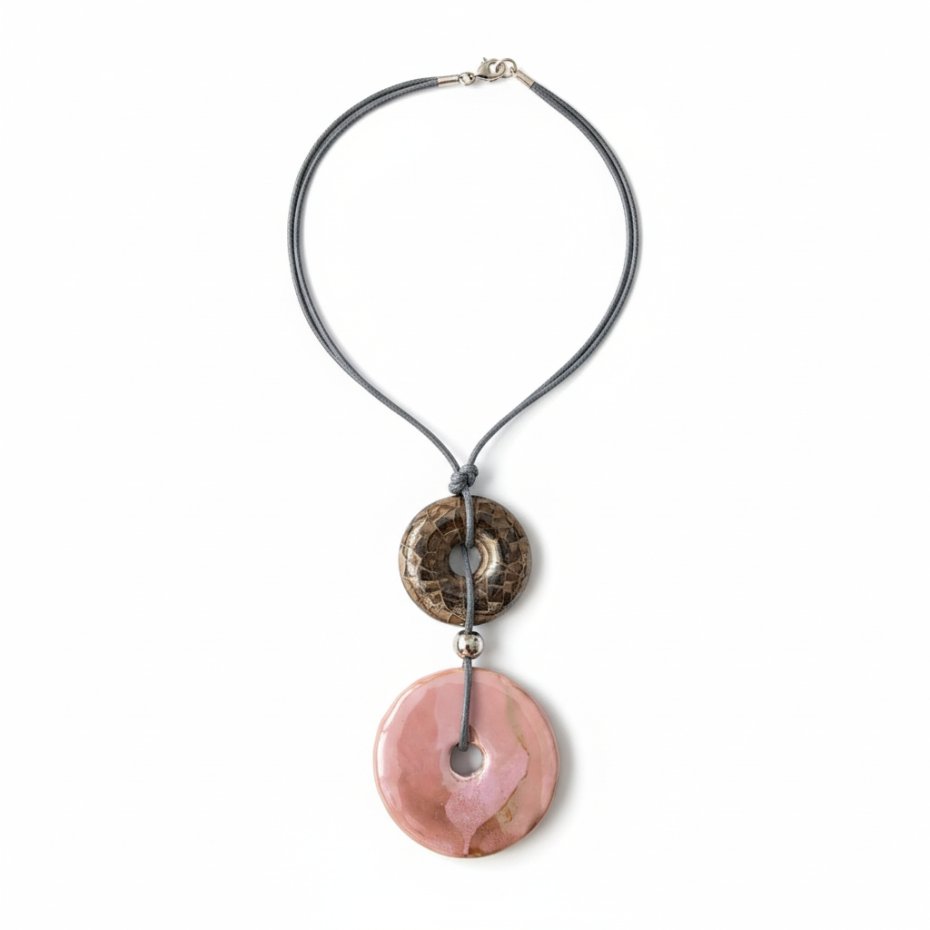 Wisior wykonany z dwóch, płaskich, okrągłych, szkliwionych elementów ceramicznych (ceramika grecka). Każdy z nich został wykonany ręcznie - jest jedyny w swoim rodzaju i posiada drobne niedoskonałości świadczące o jego manufakturowym pochodzeniu). Mniejsze koło ma średnicę ok. 3,3cm, zaś większe ok. 4,3cm.