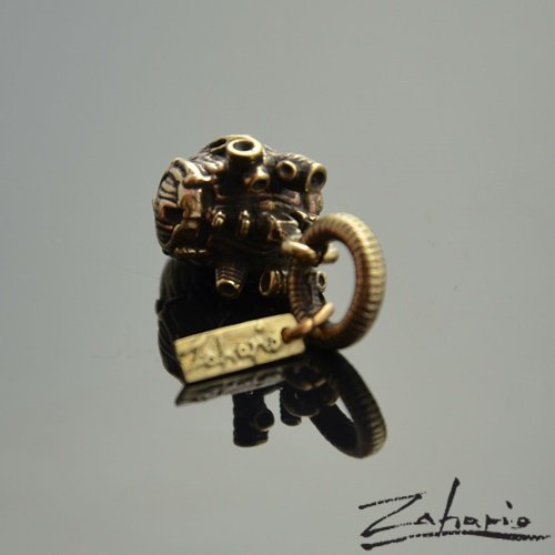 Wisior w kształcie biomechanicznego serca wykonany ręcznie z brązu. Detale robione pod lupą.
