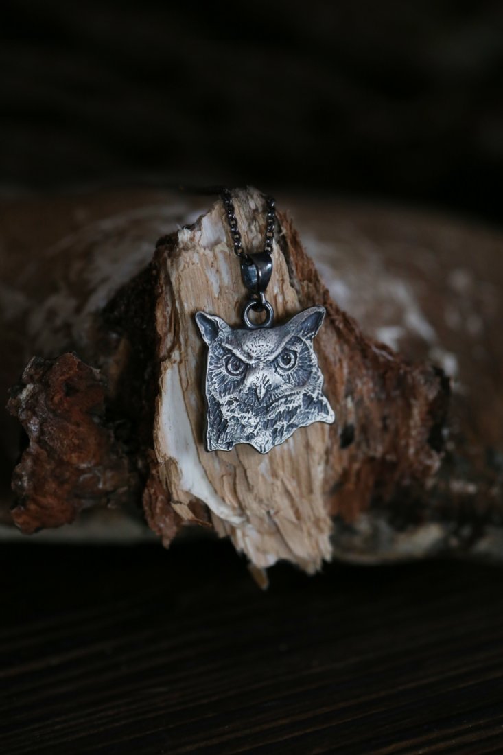 Sowa puchacz jest jednym z dzikich zwierzaków spod znaku marki Cztery Humory. Wisiorek powstał według autorskiego projektu widocznego na zdjęciu. Srebro pokryto oksydą, nadającą mu stalowo - szary odcień i przetarto dla wydobycia szczegółów zawieszki.