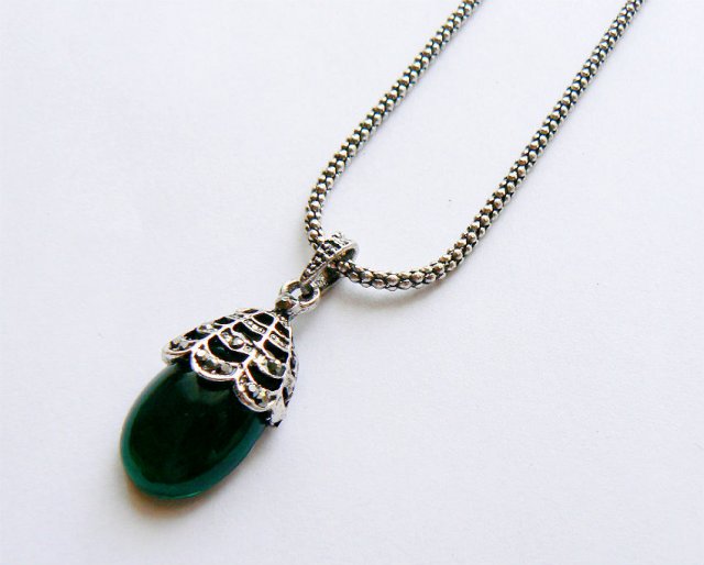 miedzi, cynku, niklu, niekiedy z dodatkiem manganu i cyny). Łańcuszek typu żmijka o grubości 2mm. Zawieszka w kształcie łezki z dużym ciemno zielonym oczkiem, zdobiona dodatkowo maleńkimi kryształkami.