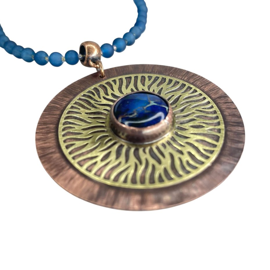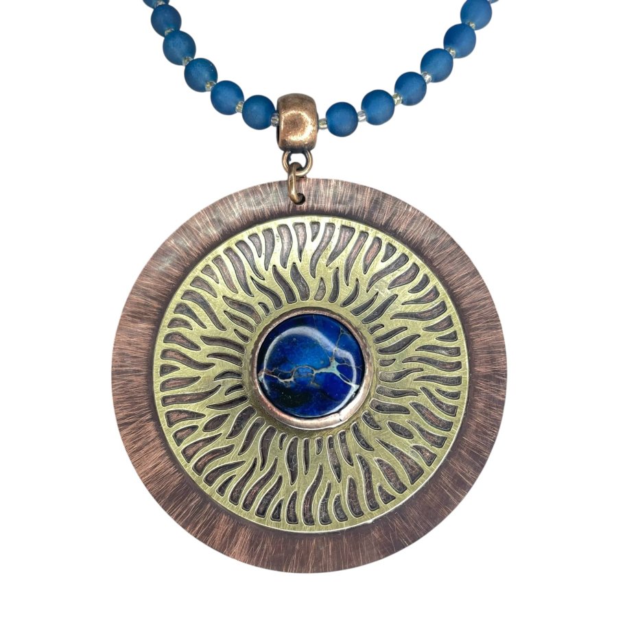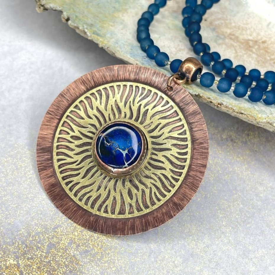 Miedziany wisior z jaspisem cesarskim zachwyca głęboką, niebieską barwą kamienia, który został osadzony w centrum oprawy. Jego formę podkreśla dekoracyjny, ażurowy element z mosiądzu układający się w promienisty motyw rozety, wyraźnie kontrastujący z patynowaną miedzią. Teksturowanie metalu nadaje całości artystyczny charakter i szlachetne wykończenie, widoczne w każdym detalu. Wisior zawieszony jest na naszyjniku ze szklanych koralików o średnicy 4–5 mm, dobranych kolorystycznie do odcienia jaspisu.